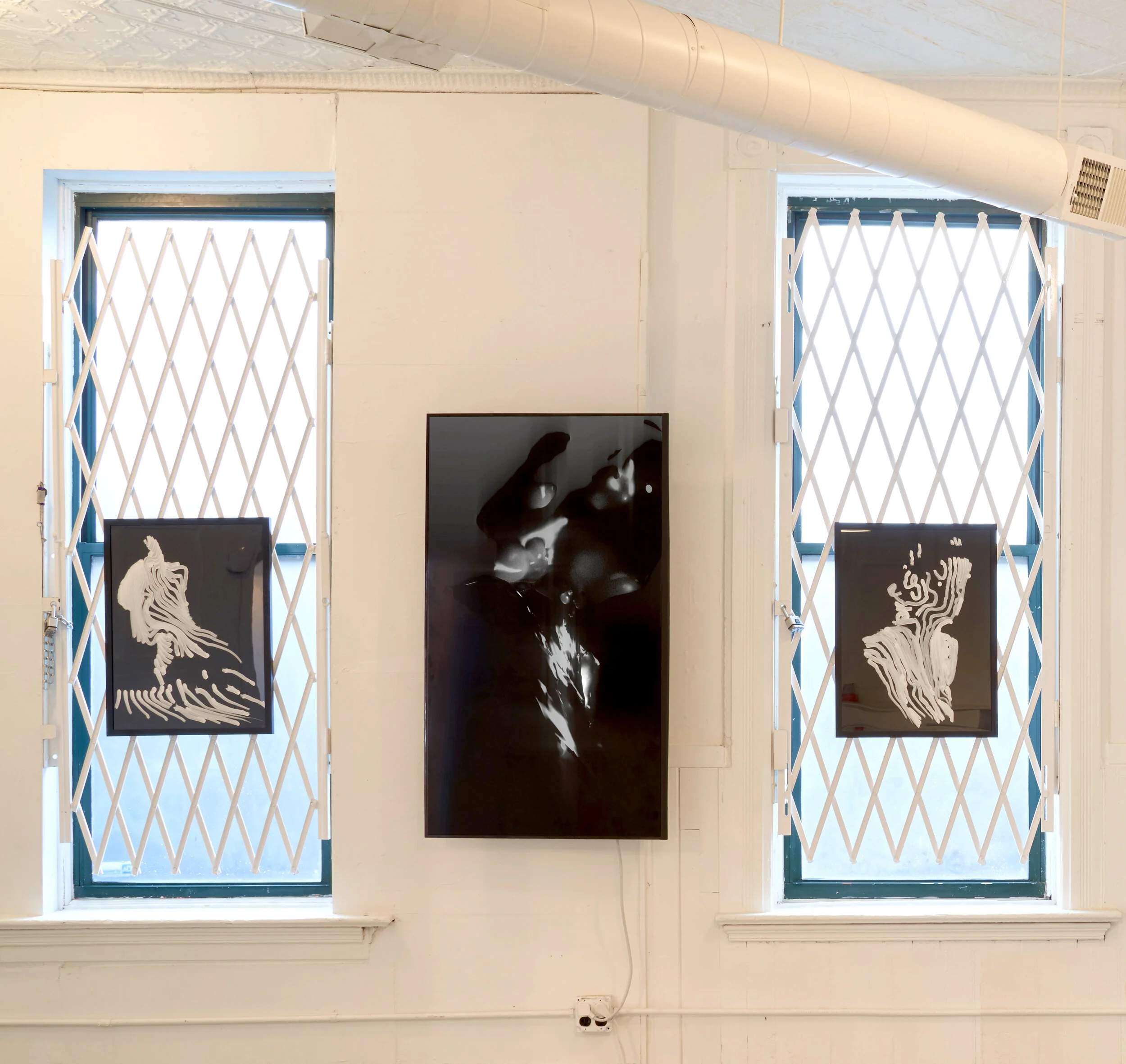 In installation space, Advice in a Well of Midnight is displayed between two paintings from our Static Subjection series. These paintings are based off of stills and geometry from the animation.