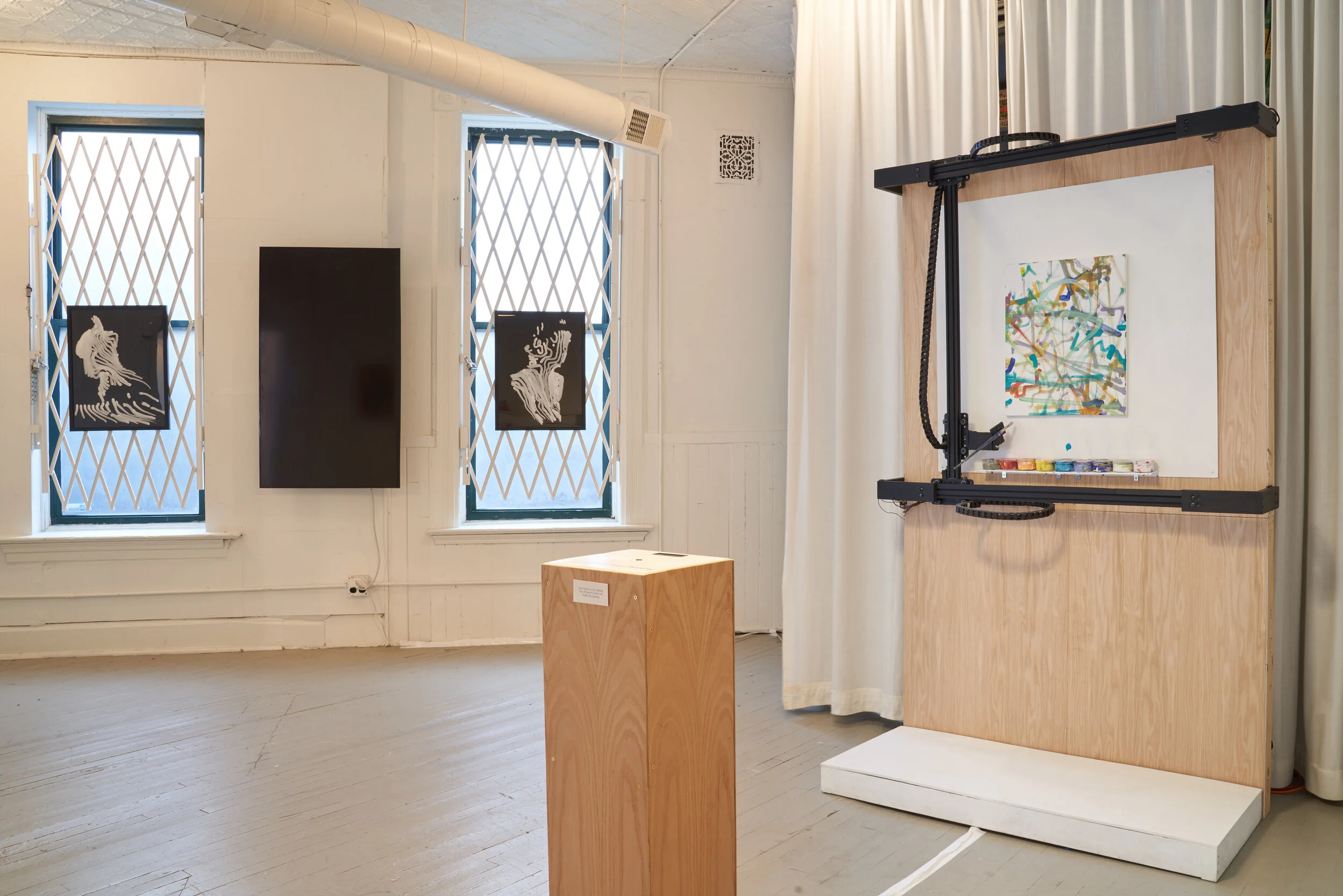 Installation view with our painting robot in the foreground which we used to paint our Static Subjection series.